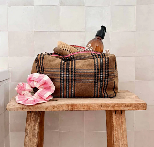 Big Trousse de toilette Tartan camel touche rose fluo