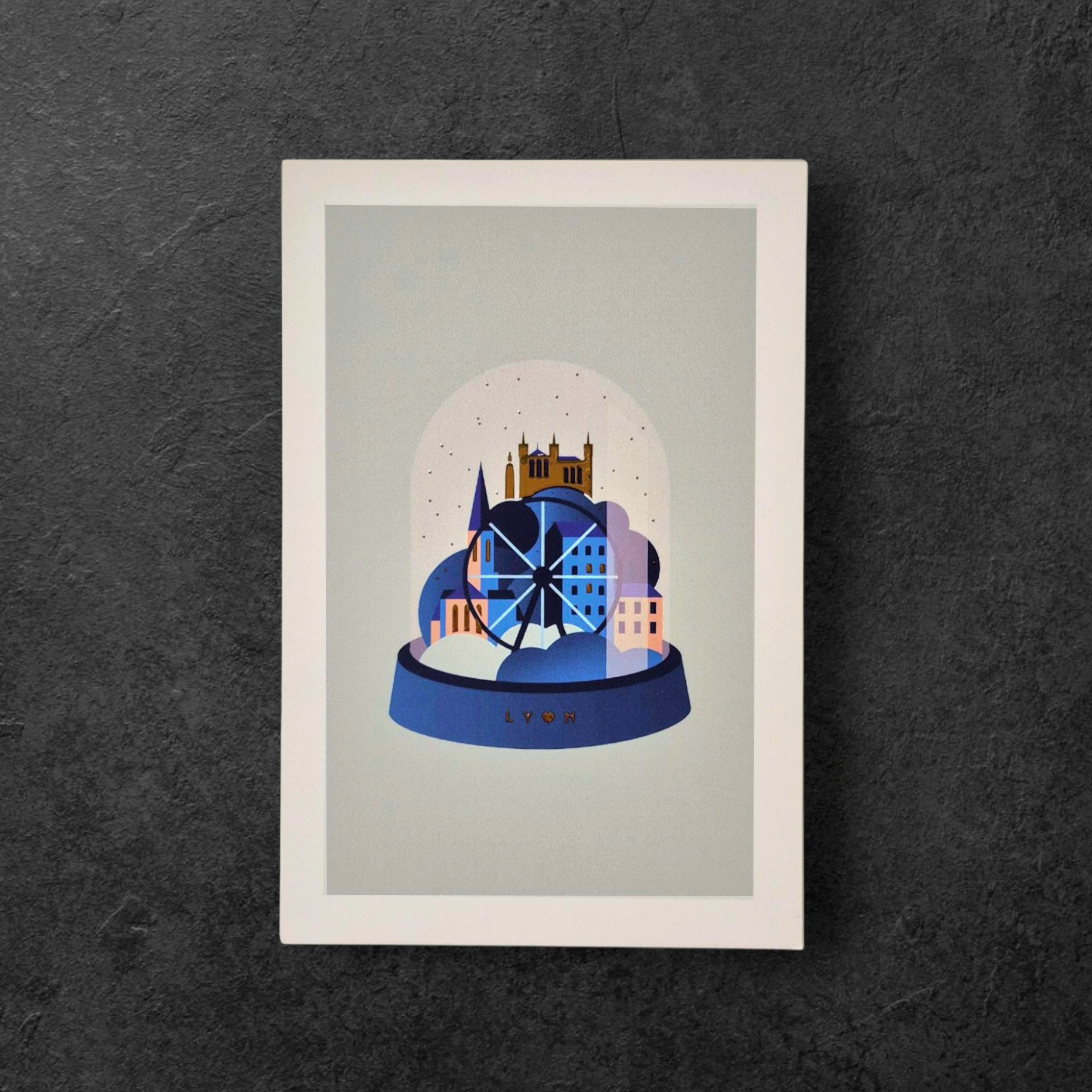 Une très jolie carte de Lyon stylisé dans une boule à neige ! Dans un doux camaïeu de bleus, avec de beaux détails en reliefs dorés (dorure à chaud), venant illuminer la carte (basilique de Fourvière, flocons de neige, fenêtres..)