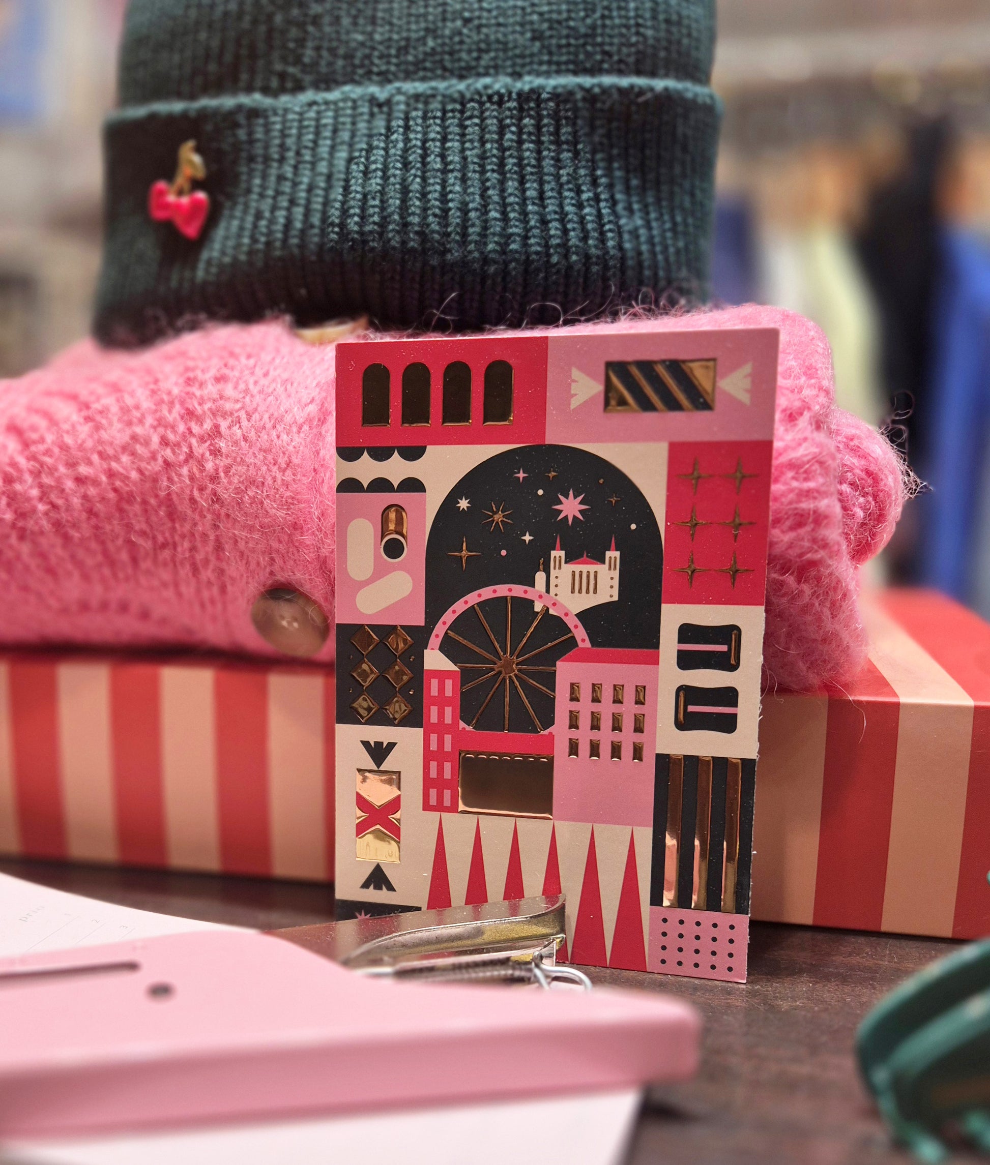 On y reconnait la basilique de Fourvière, la grande roue, les fameuses façades lyonnaises, les papillotes, coussins de Lyon, saucisson lyonnais, dans un esprit très festif décliné en tons de rose, vert, rouge, crème et doré !