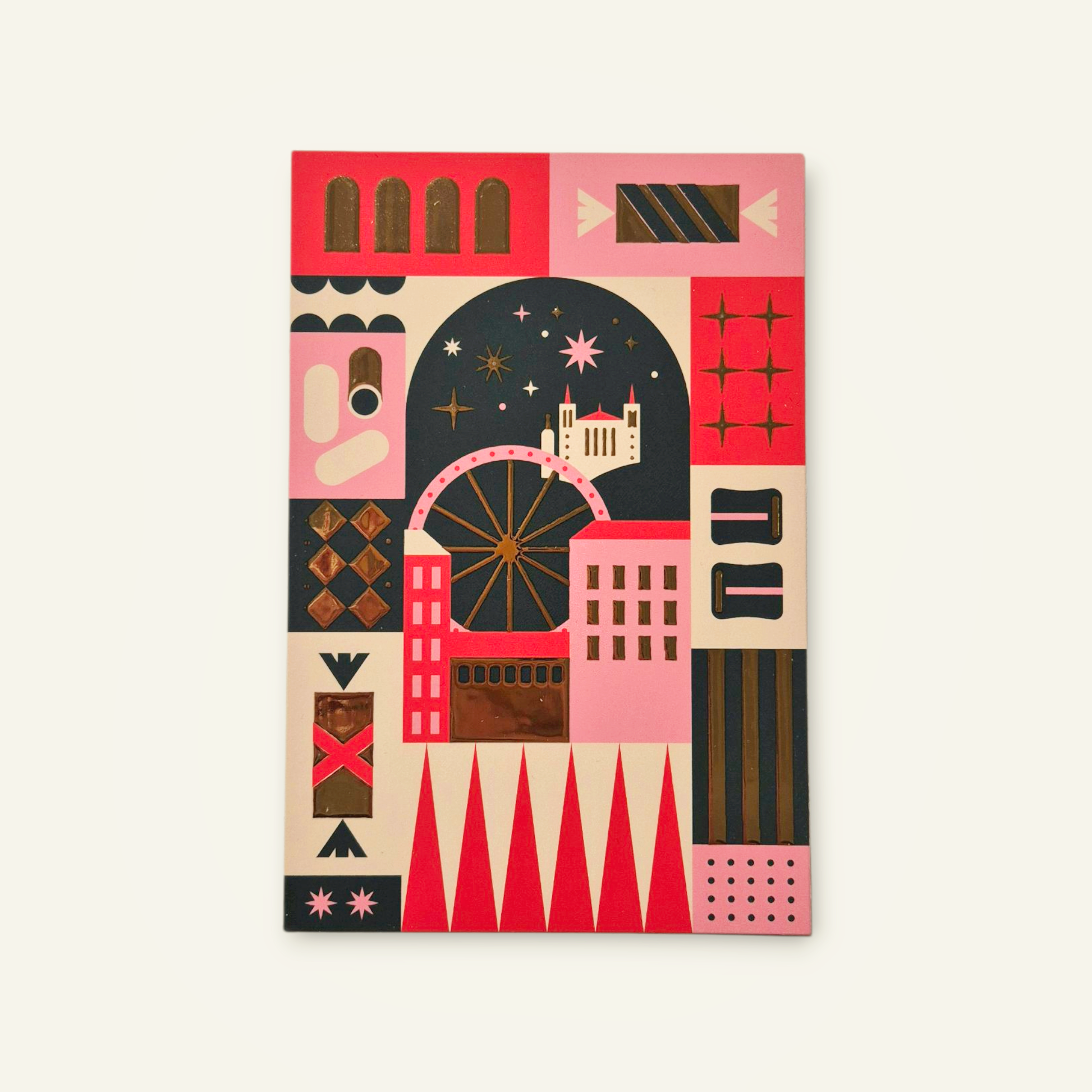 Une très jolie carte de Lyon stylisé, entre dessins et graphiques et spécialités lyonnaises, avec de très jolis détails en reliefs dorés (dorure à chaud), venant illuminer la carte.