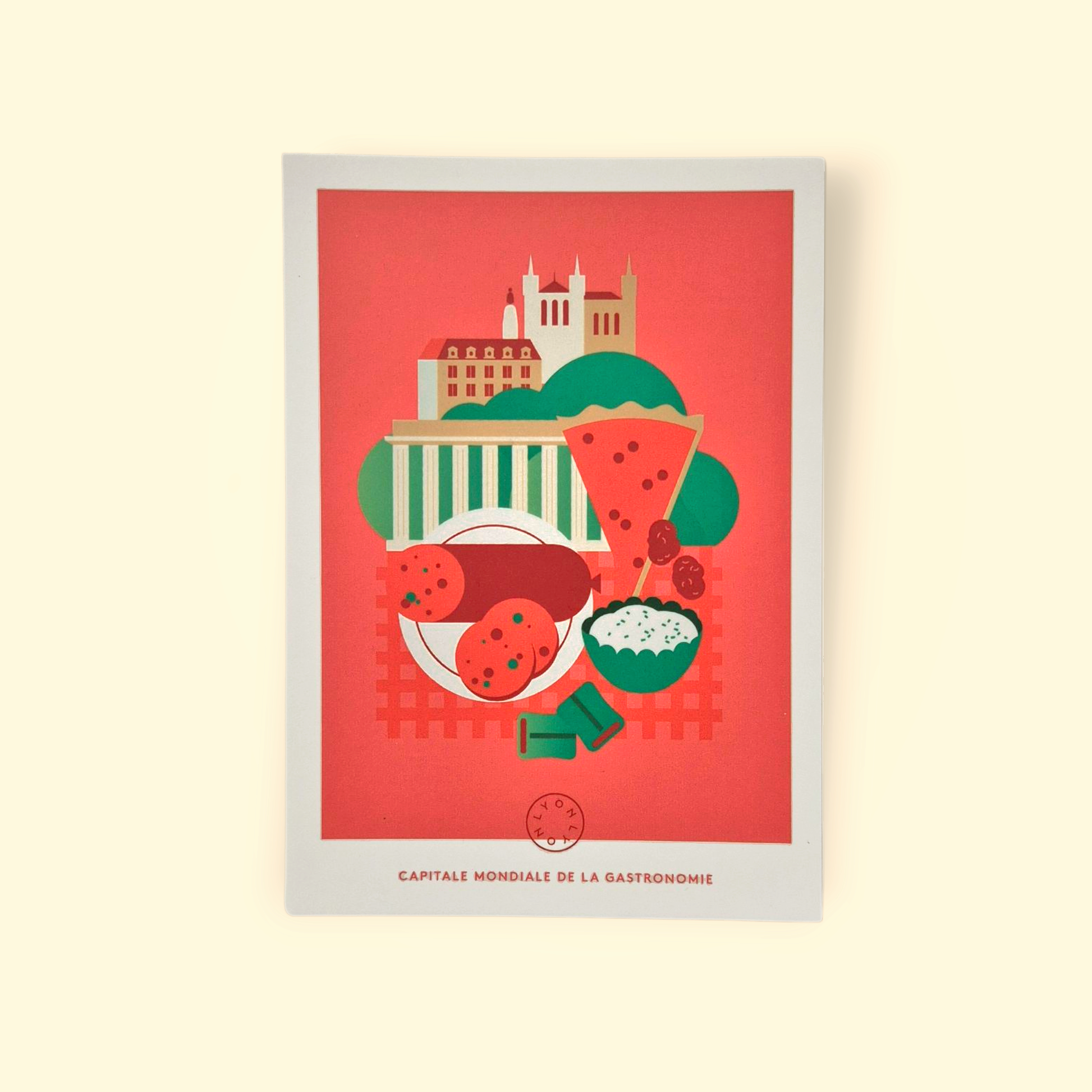 Sur un fond coloré avec vue sur le Vieux Lyon et la basilique de Fourvière, mets locaux s'entremêlent : tarte à la praline, coussins lyonnais, cervelle de Canut et saucisson pistaché !