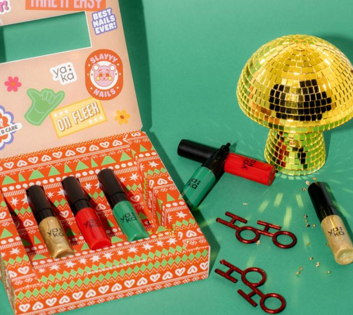 Le coffret de vernis à ongles 2-en-1 Ho Ho Ho est une invitation à briller pendant les fêtes tout en s’amusant ! Un doré lumineux, un rouge éclatant et un vert profond : notre trio festif te permet de créer des manucures de Noël facilement directement à la maison ✨