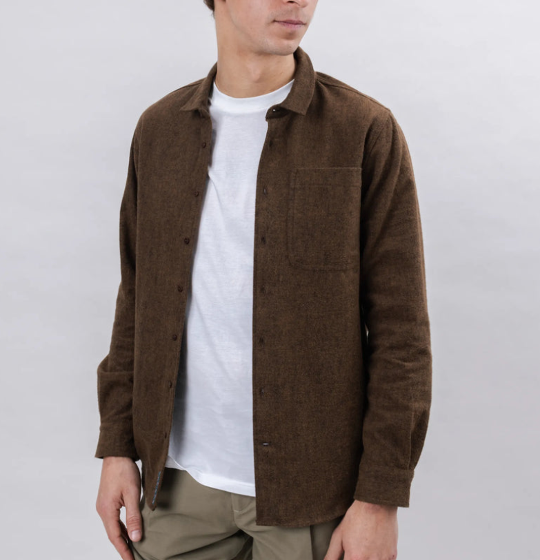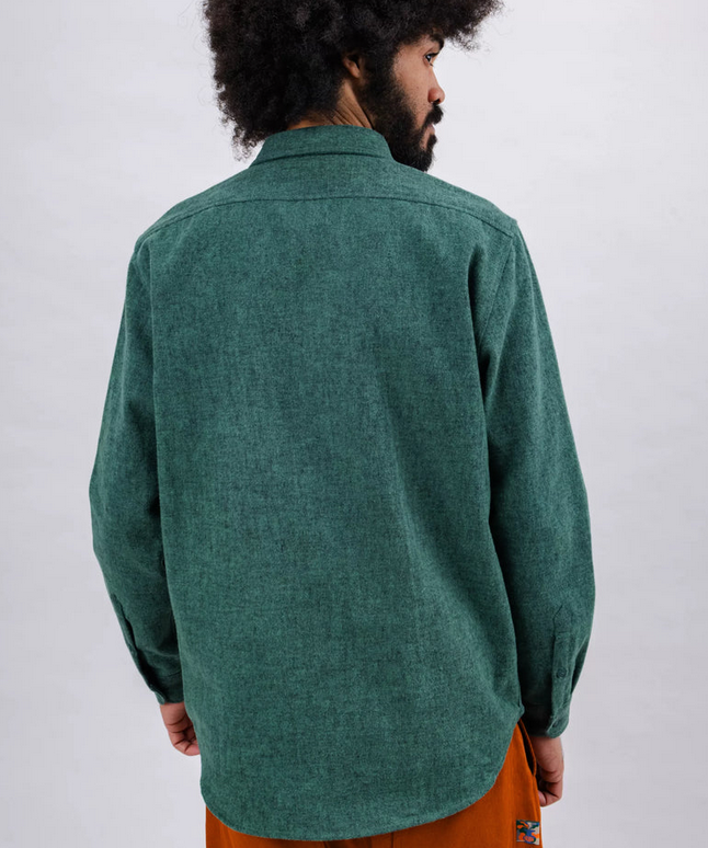 Le poche plaquée devant vient structurer le vêtement, et le petite patch brodé en bas de chemise sur la patte de boutonnage amène une touche colorée et graphique.