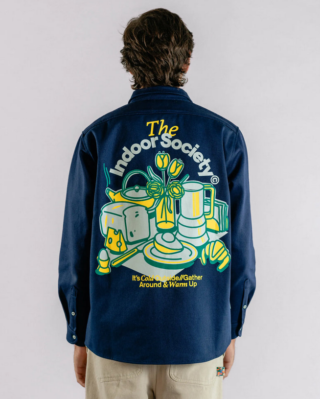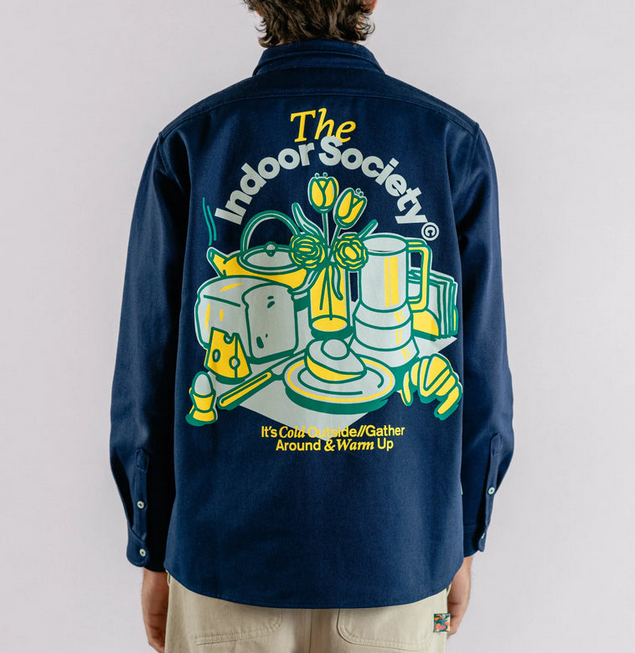 Et évidemment, on est archi fan de son grand motif dorsal : The indoor society, recréant une illustration graphique d'un petit déjeuner, par l'illustrateur barcelonais Medina Oscar, dans des tons de blanc, jaune vif, vert, se mariant et contrastant à merveille avec le fond bleu nuit.