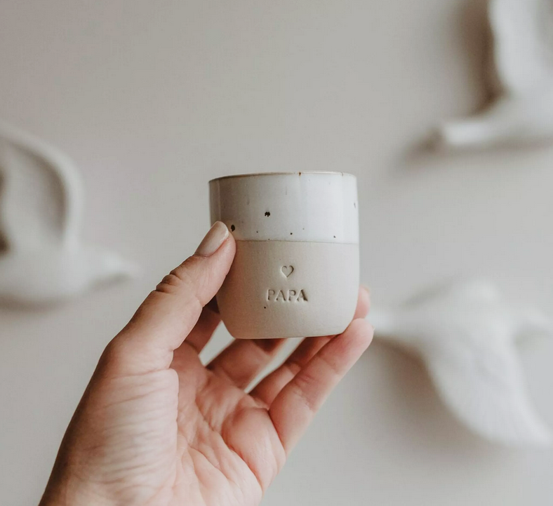 Elle joue sur un contraste de matières avec un émaillage subtil, légèrement moucheté, et sa base laissée brute, simplement tamponnée pour faire apparaître un joli message.